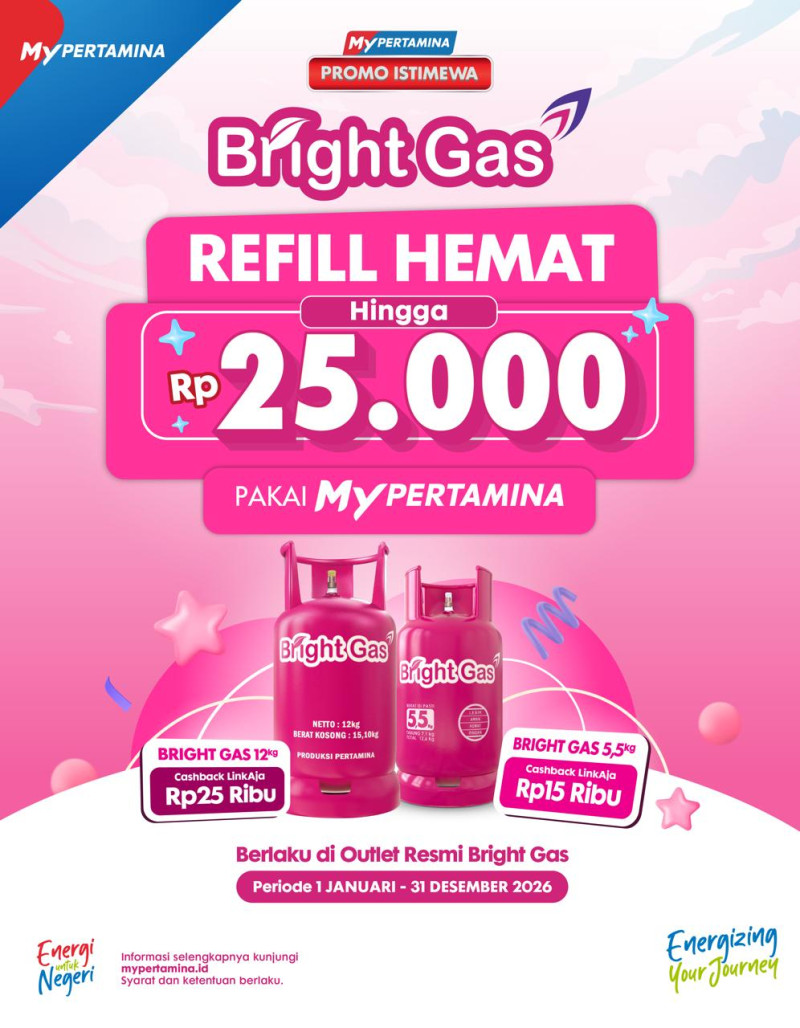 Baca Juga:Promo ini berlaku untuk transaksi minimal Rp90.000 dengan metode pembayaran MyPertamina LinkAja, di mana konsumen berkesempatan memperoleh cashback hingga Rp25.000 serta poin MyPertamina. Program refill Bright Gas ini berlangsung sepanjang tahun 2026 dan berlaku hingga 31 Desember 2026.